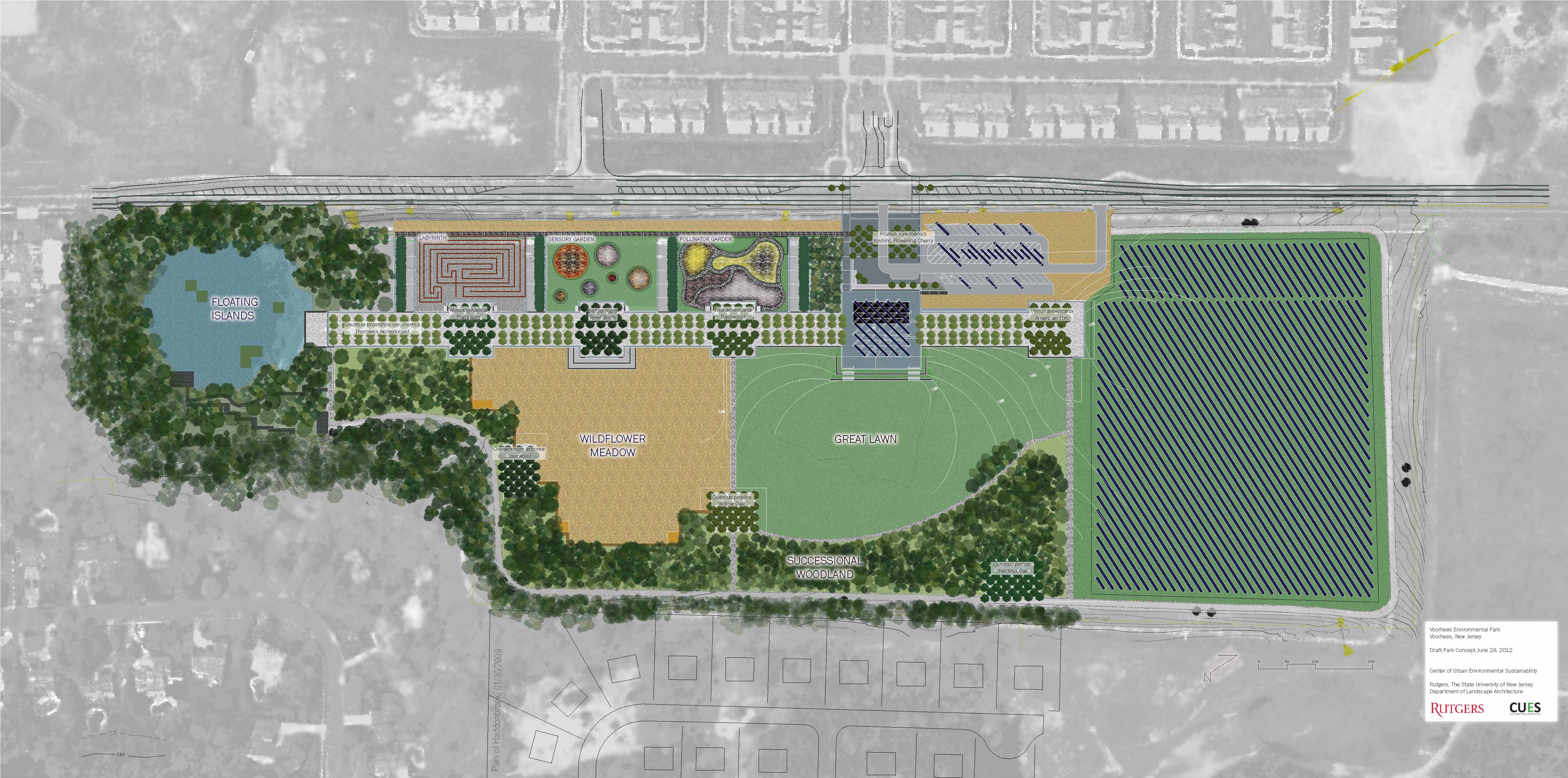 The juxtaposition of solar panels and a public park is unique. A public park allows free movement for everybody, providing open spaces for play, social interactions and enjoyment of nature, while solar panels are usually located in a fenced light industrial area unsuitable for public access. Creating a meaningful design relationship between solar energy production in a public park setting was a unique challenge for Rutgers students developing conceptual designs for Voorhees Environmental Park. The objective of a semester-long graduate design studio in the Rutgers Department of Landscape Architecture was to develop an integrated concept for open space, energy production, and storm water management.